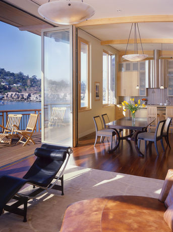 This five-level, waterfront home features large cantilevered decks, 12’ distinctive folding doors and custom curved staircases.